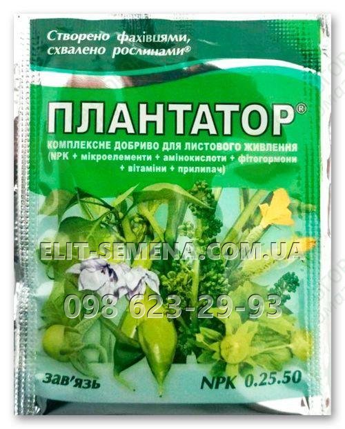 Плантатор (Plantafol, Плантафол) зав'язь (NPK 0.25.50), упаковка 25 гр - комплексне добриво листового харчування (NPK + мікроелементи + амінокислоти + фітогормони + вітаміни + прилипач). Водорозчинне добриво-регулятор з мікроелементами у вигляді хелатів, призначене для позакореневого підживлення овочів, ягід, плодових дерев і чагарників.